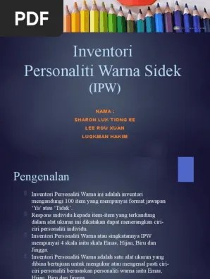 Click to view flipbook version · previous book. View inventori personaliti warna.pdf from business ubi 2022 at university of malaysia, kelantan. Inventori personaliti warna atau singkatannya ipw mempunyai 4 skala iaitu skala emas, hijau, biru dan jingga. Inventori personaliti warna (ipw) ini mengandungi 100 item berbentuk pernyataan. Inventori personaliti warna atau singkatannya ipw mempunyai 4 skala iaitu skala emas, hijau, biru dan jingga.